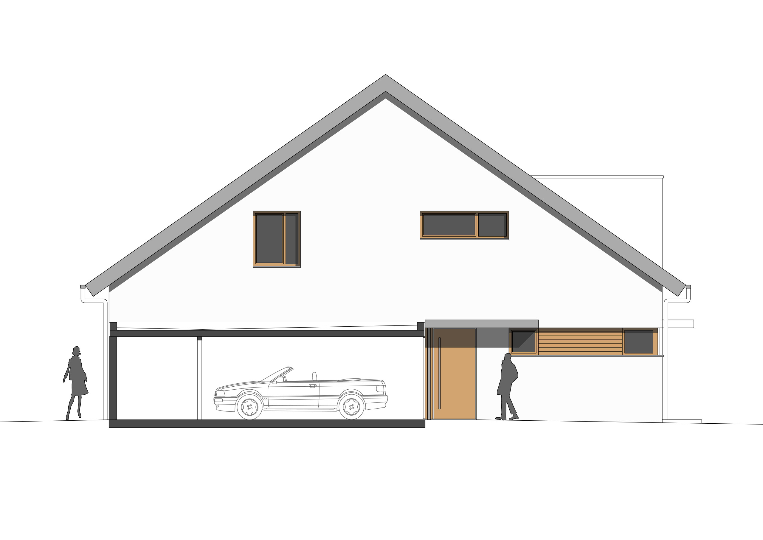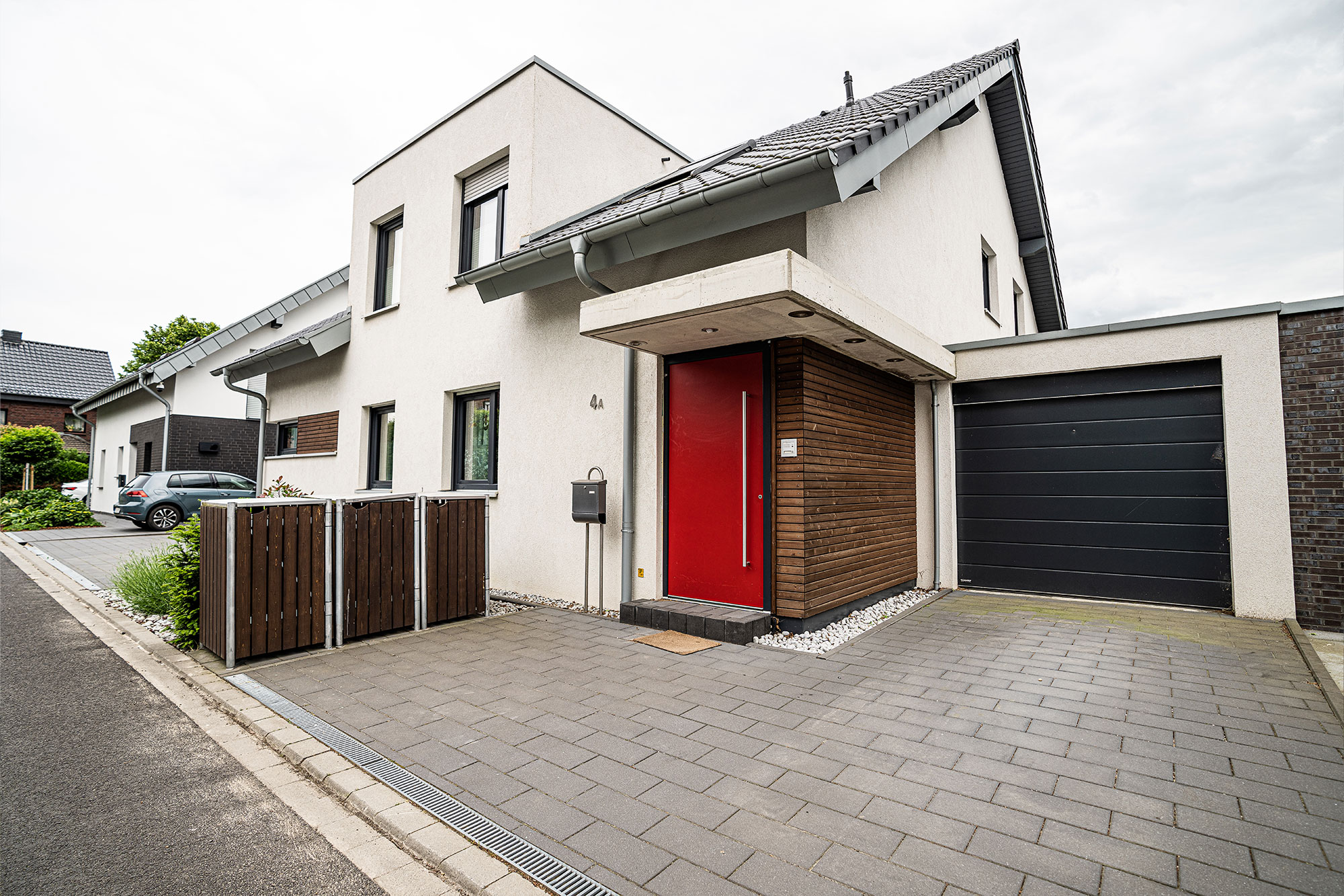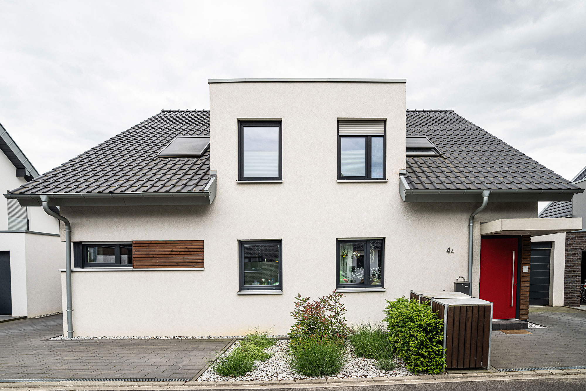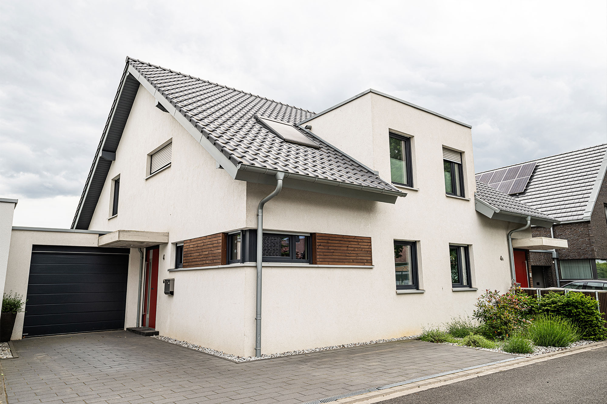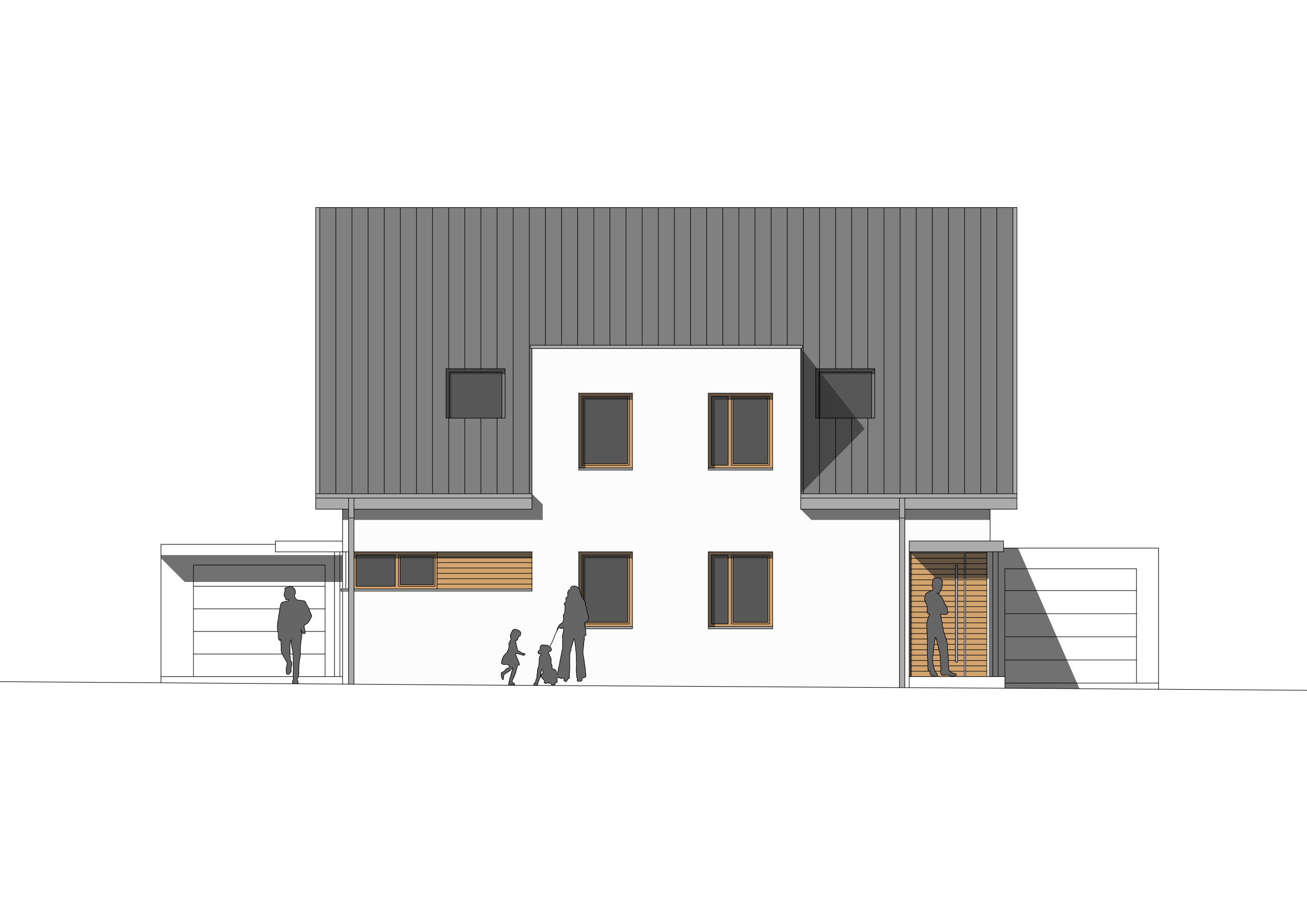 Entstanden ist ein zweigeschossiges Zweifamilienhaus mit zwei separaten Eingängen und jeweils einer zugeordneten Garage an den Giebelseiten.