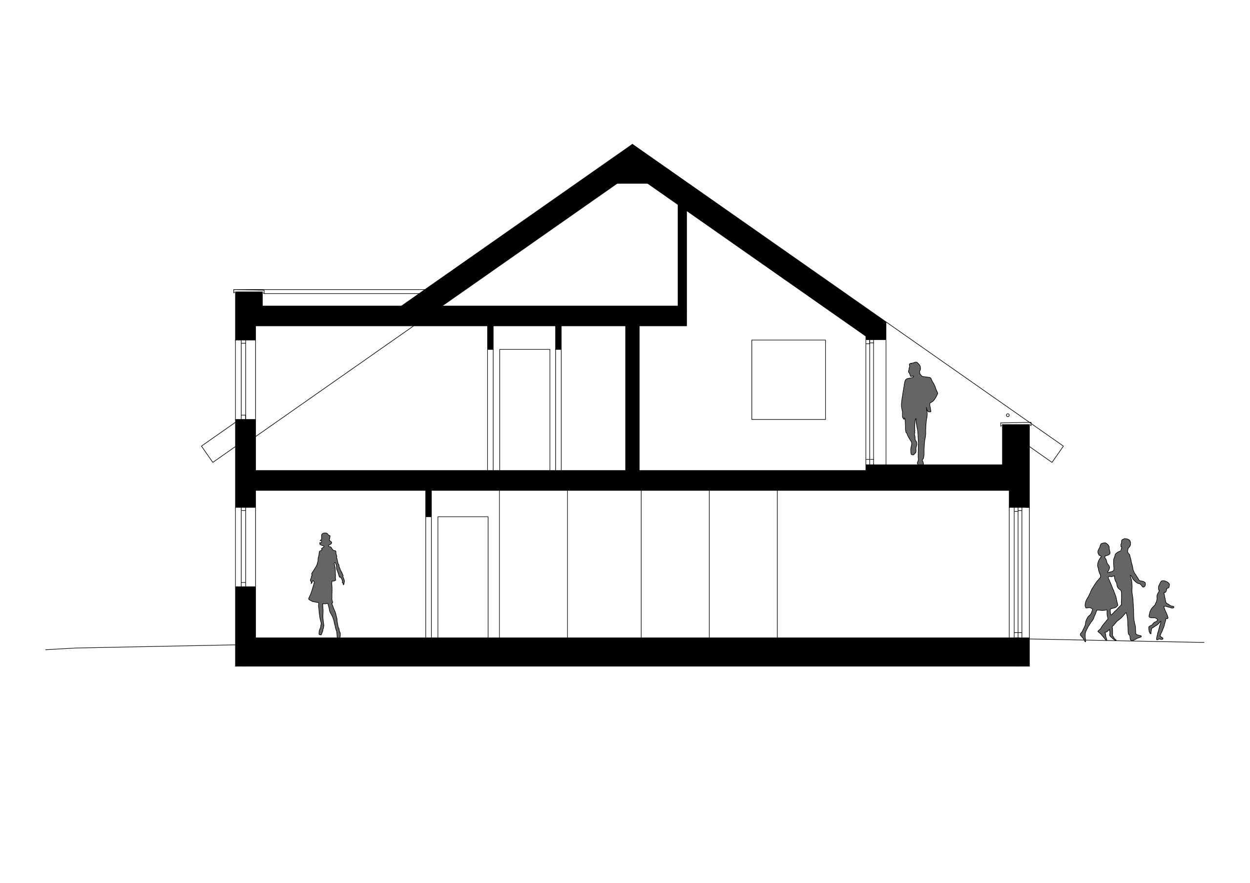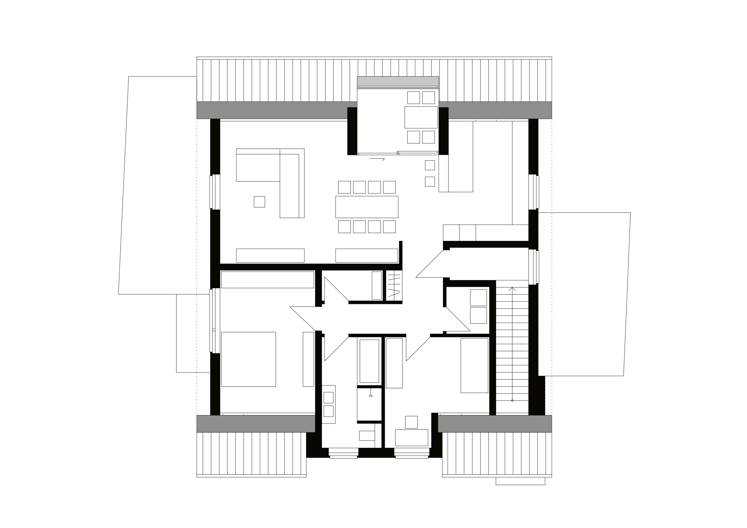 Die offen gestaltete Wohnung im Obergeschoss ist ebenso funktional geplant und wird zusätzlich durch eine Galerie zum Spitzboden, der als Büro oder Bibliothek dient, aufgewertet. Der Dacheinschnitt fungiert als Dachterrasse.