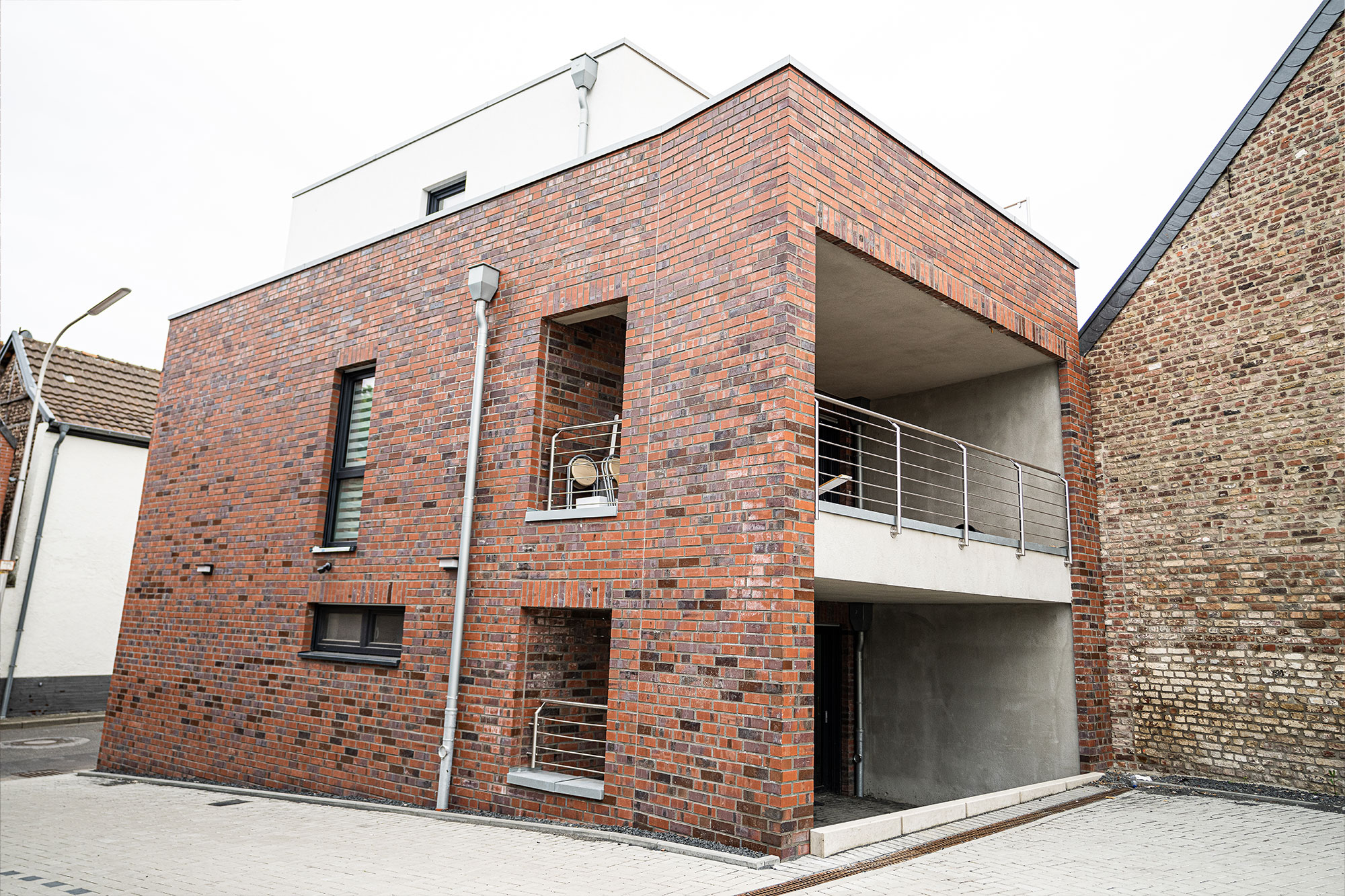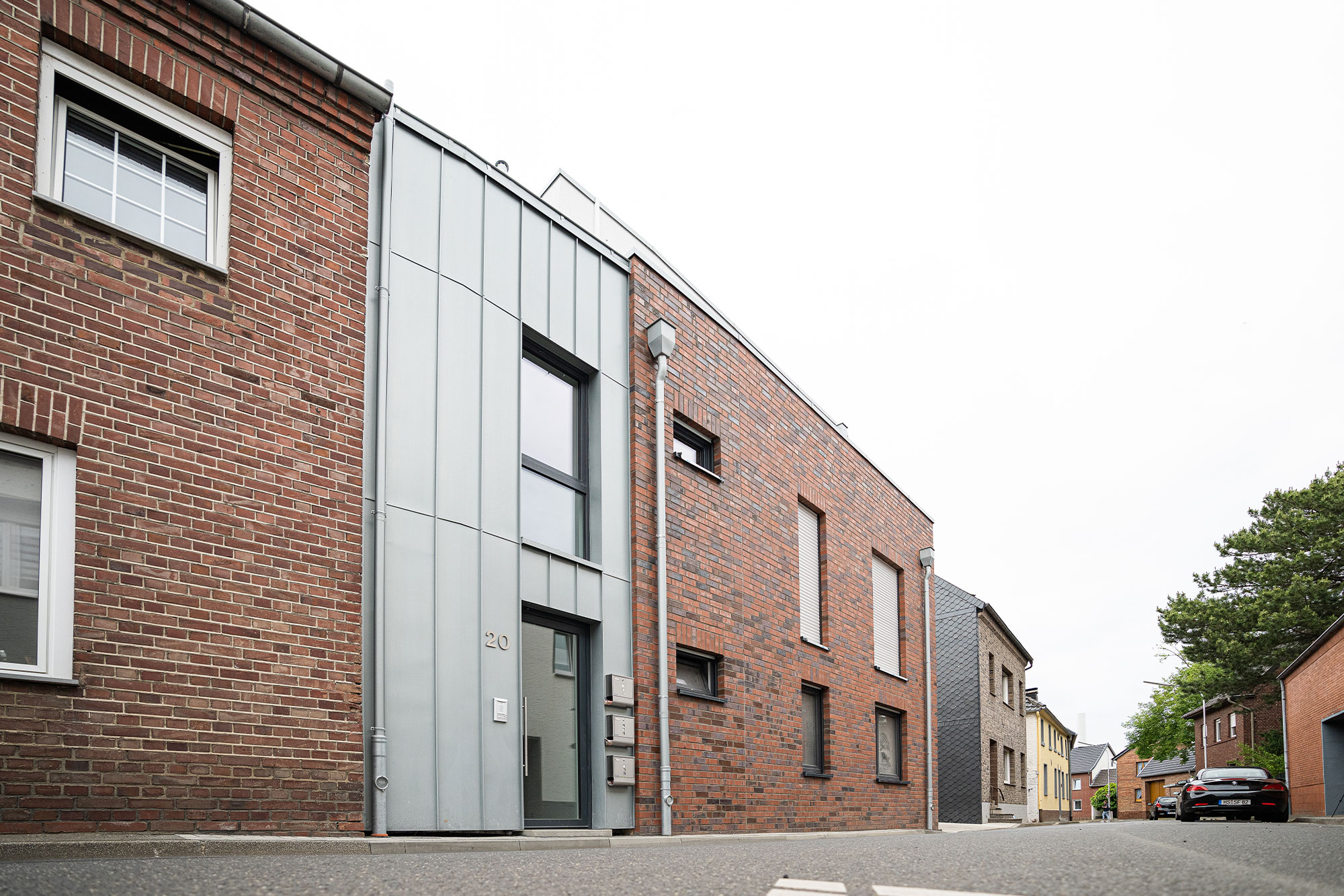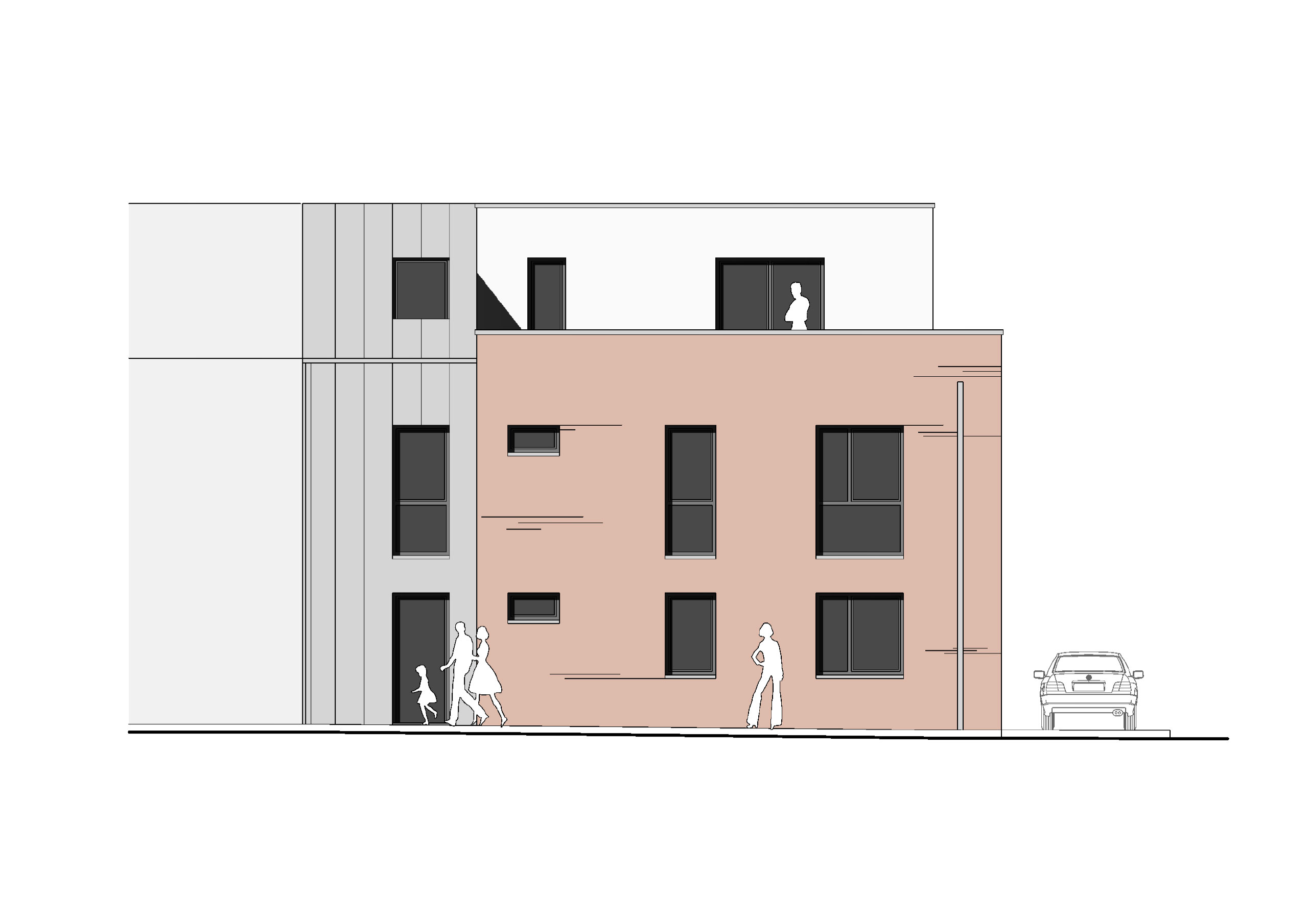 In enger Abstimmung mit der Bauaufsicht entstand unter Wahrung des Planungsrechts und der nachbarschaftlichen Interessen schließlich ein dreigeschossiges 3-Familienhaus. Für die optimale Ausnutzung des Grundstücks wurden Parkplätze im rückwärtigen Bereich eingeplant. Aufgrund der auf der Straße gewachsenen Steildachbebauung wurde ein geneigtes Dach nur als Übergang bzw. Fuge in Breite des neuen Erschließungsbaukörpers adaptiert. Das daran neu geplante angrenzende Staffelgeschoss als Flachdach bietet somit ausreichende Deckenhöhen sowie eine große Dachterrasse für eine hochwertige Wohnungsnutzung.