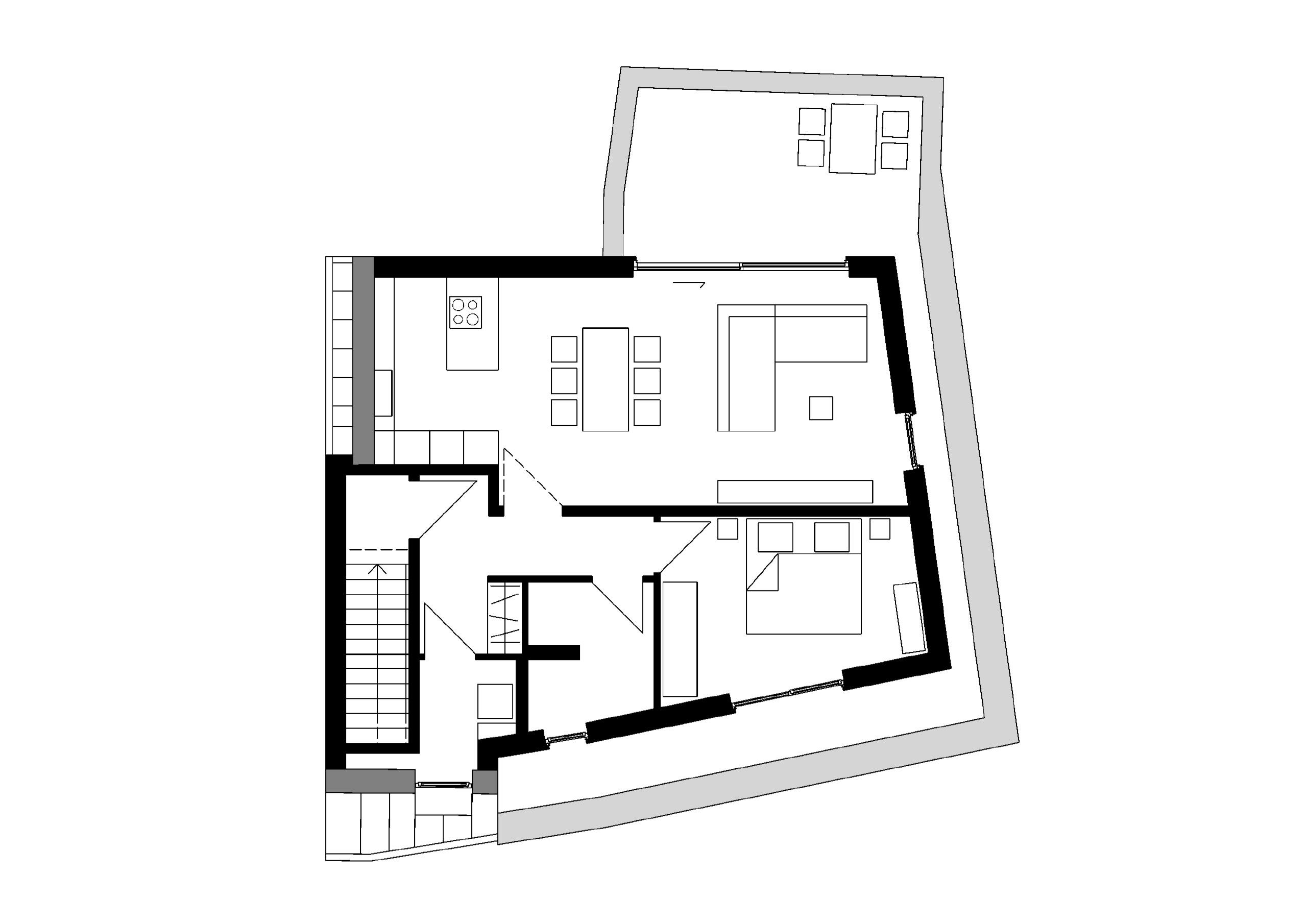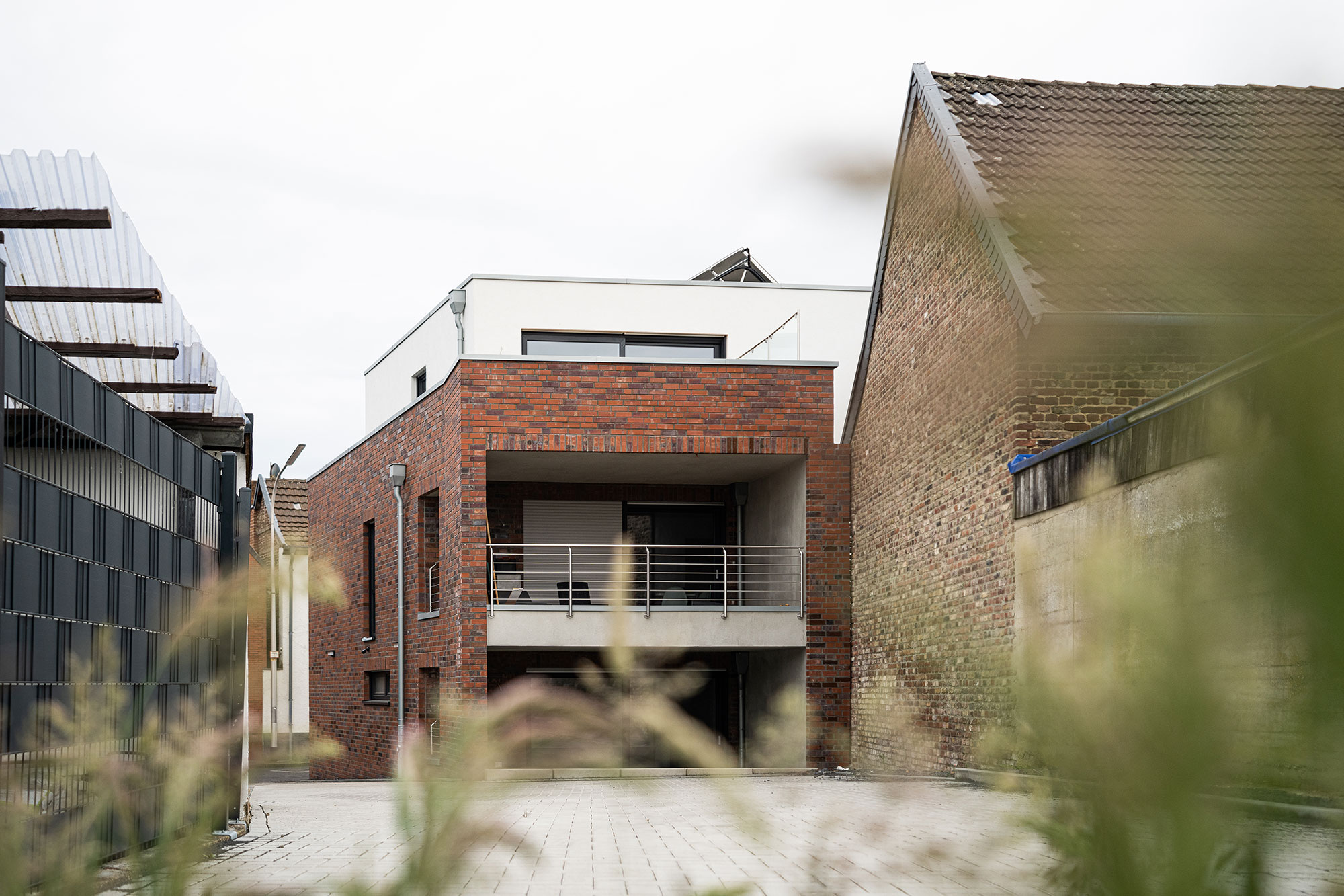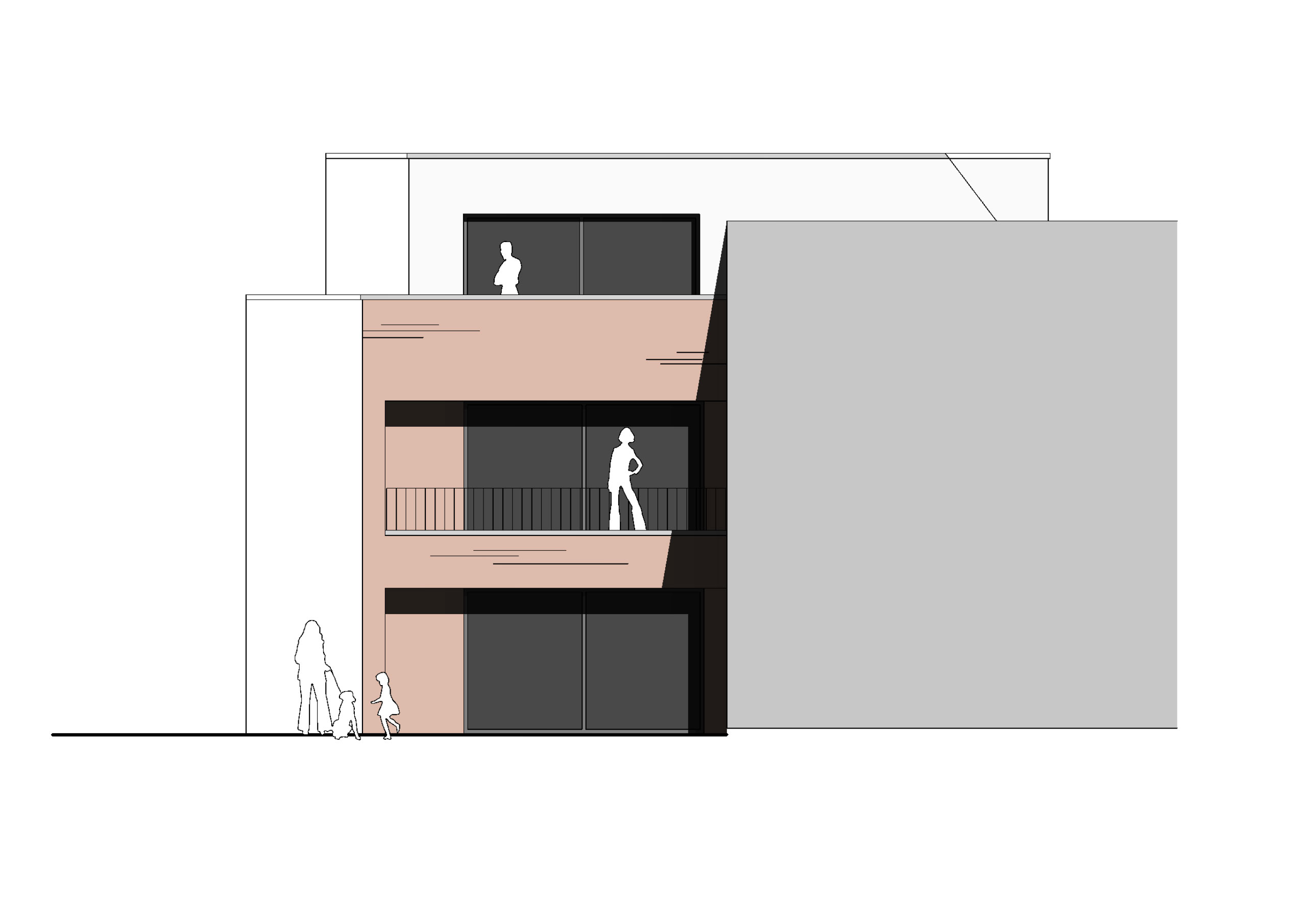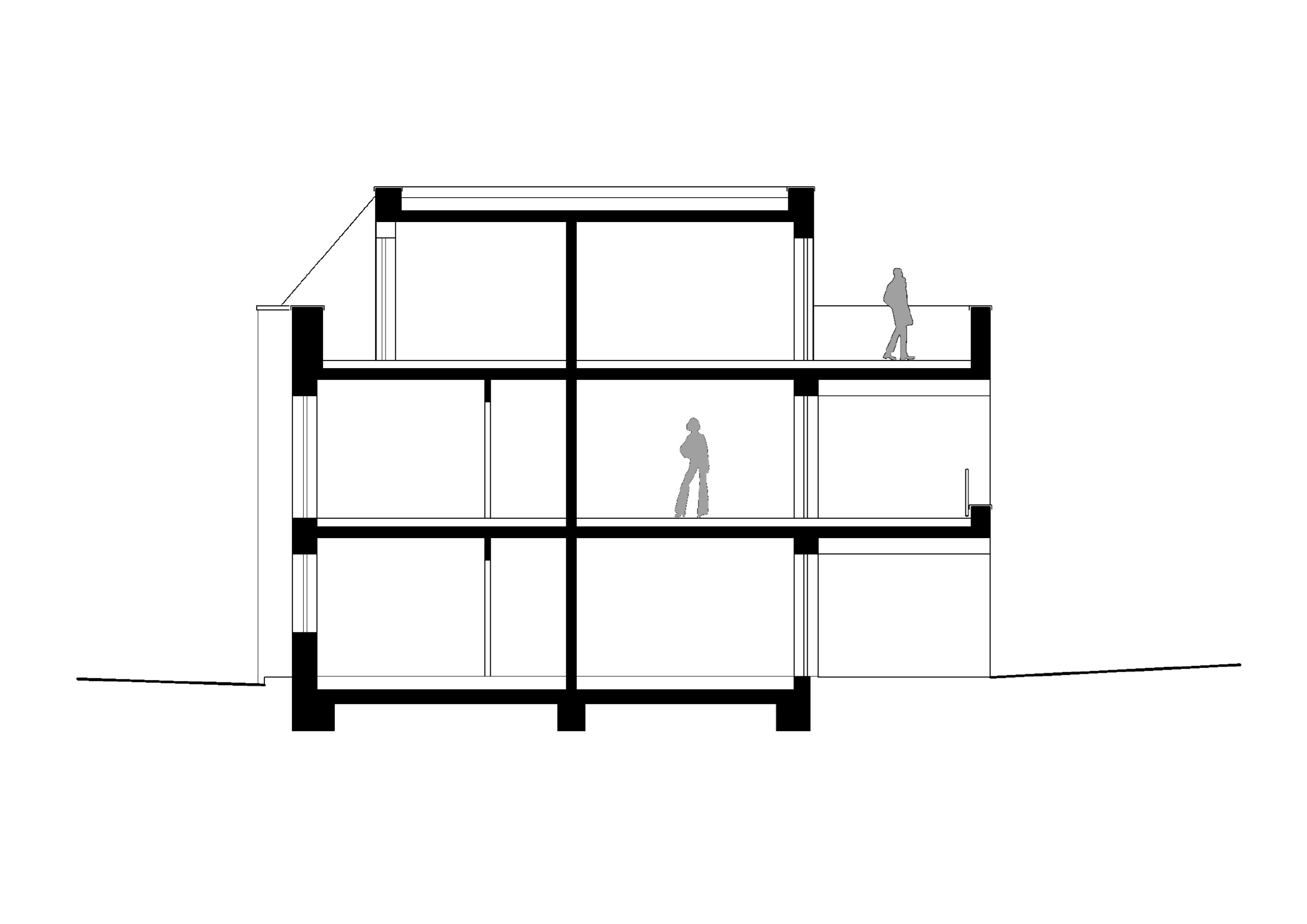 In enger Abstimmung mit der Bauaufsicht entstand unter Wahrung des Planungsrechts und der nachbarschaftlichen Interessen schließlich ein dreigeschossiges 3-Familienhaus. Für die optimale Ausnutzung des Grundstücks wurden Parkplätze im rückwärtigen Bereich eingeplant. Aufgrund der auf der Straße gewachsenen Steildachbebauung wurde ein geneigtes Dach nur als Übergang bzw. Fuge in Breite des neuen Erschließungsbaukörpers adaptiert. Das daran neu geplante angrenzende Staffelgeschoss als Flachdach bietet somit ausreichende Deckenhöhen sowie eine große Dachterrasse für eine hochwertige Wohnungsnutzung.