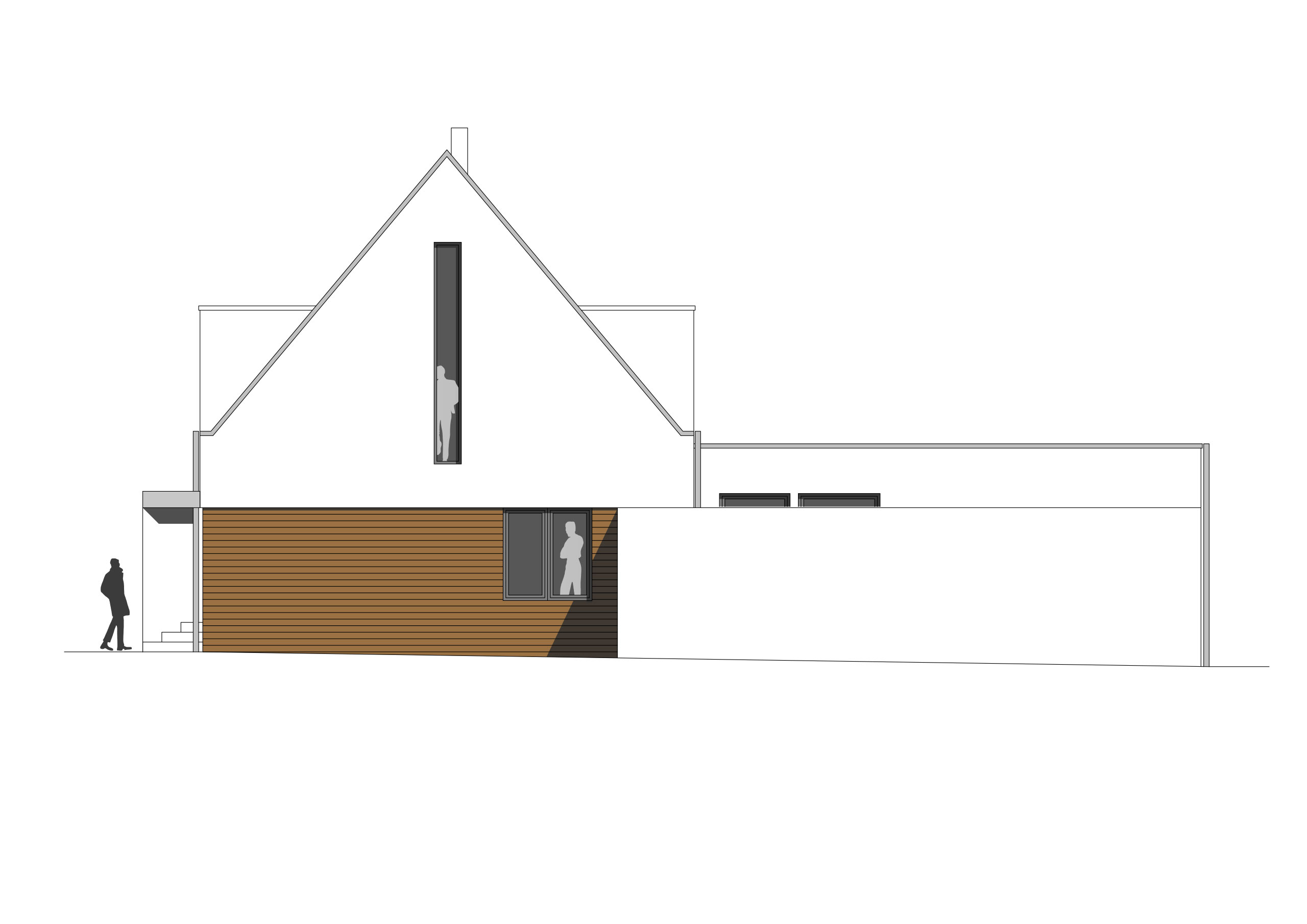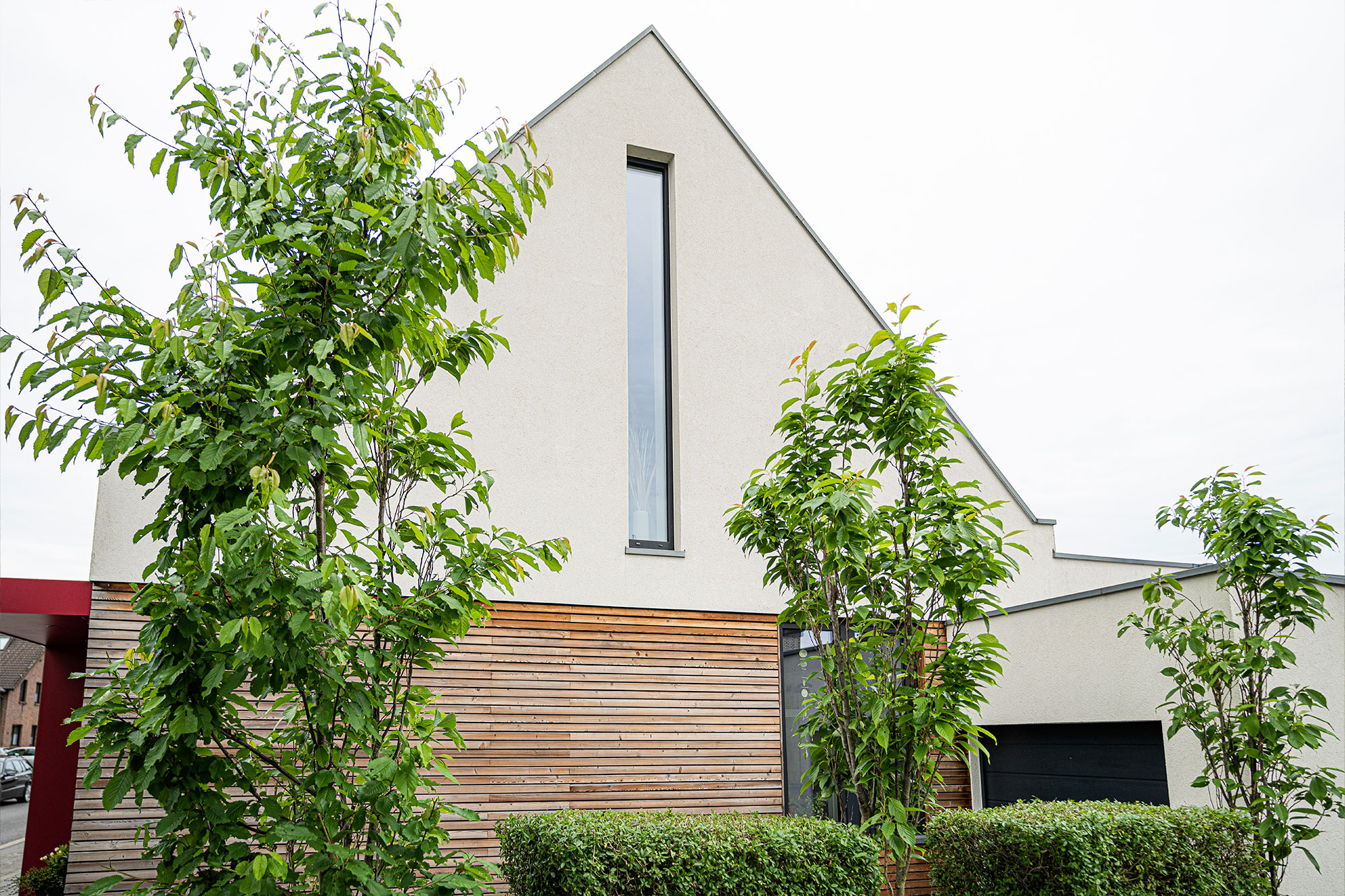 Als Adaption zum weißen Klinker der anderen bestehenden Doppelhaushälfte, wurde die Fassade weiß verputzt. Gestalterisch wurde die Gebäudeecke mit Holz akzentuiert. Die Außenentwässerung, wie Rinnen und Fallrohre, sind nicht sichtbar.