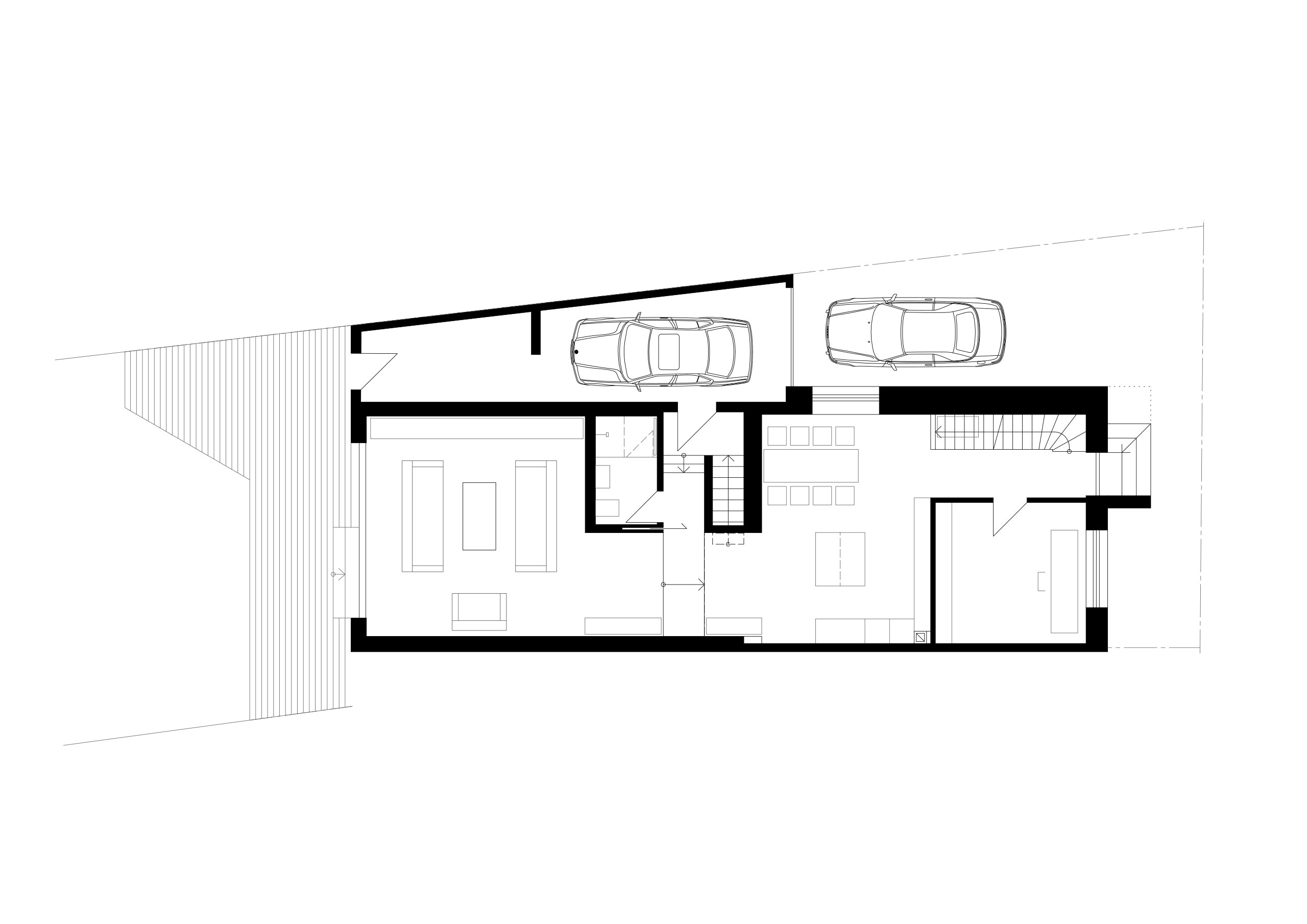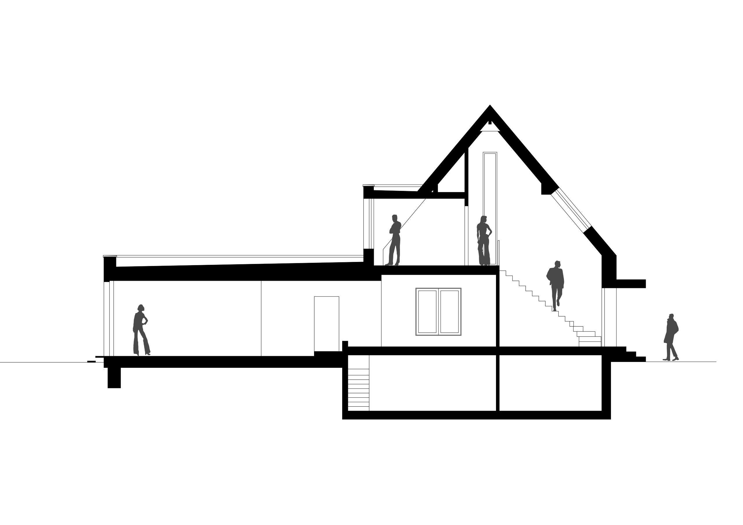 Das komplett offen gestaltete Treppenhaus bietet beim Betreten des Hauses einen Blick bis 9 Meter unter die Firstpfette. Die Offenheit wird durch die statisch aufwendig hergerichtete Glasfuge auf der Giebelseite betont. Die rückseitig geplante Erweiterung ist mit Stufen nach unten konzipiert und verleiht dem Wohnbereich hohe Decken und einen hohen Lichteinfall.