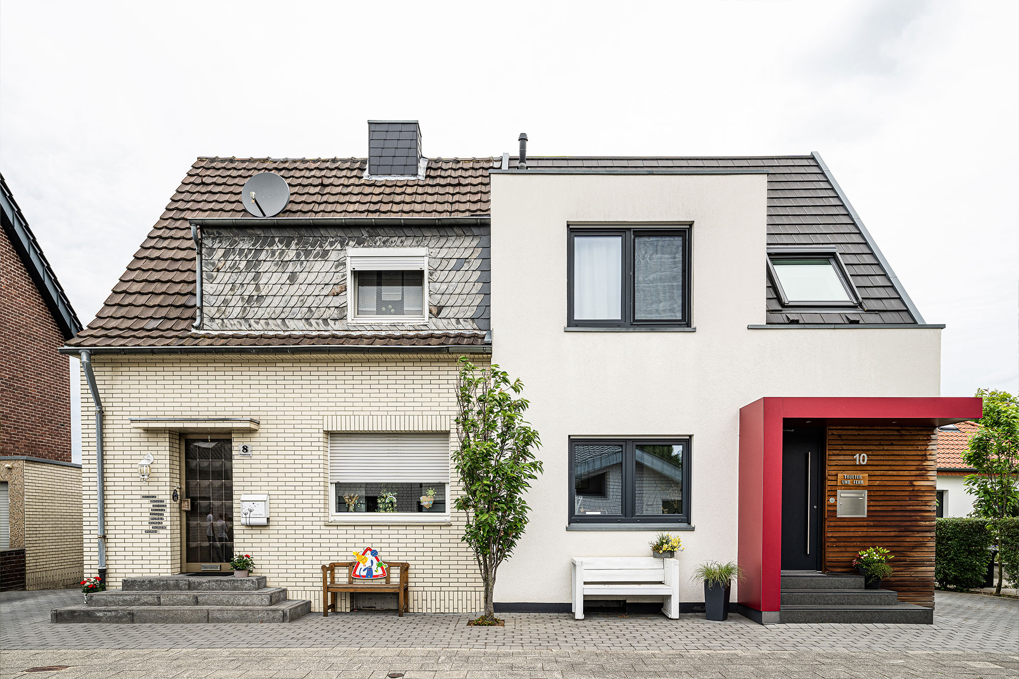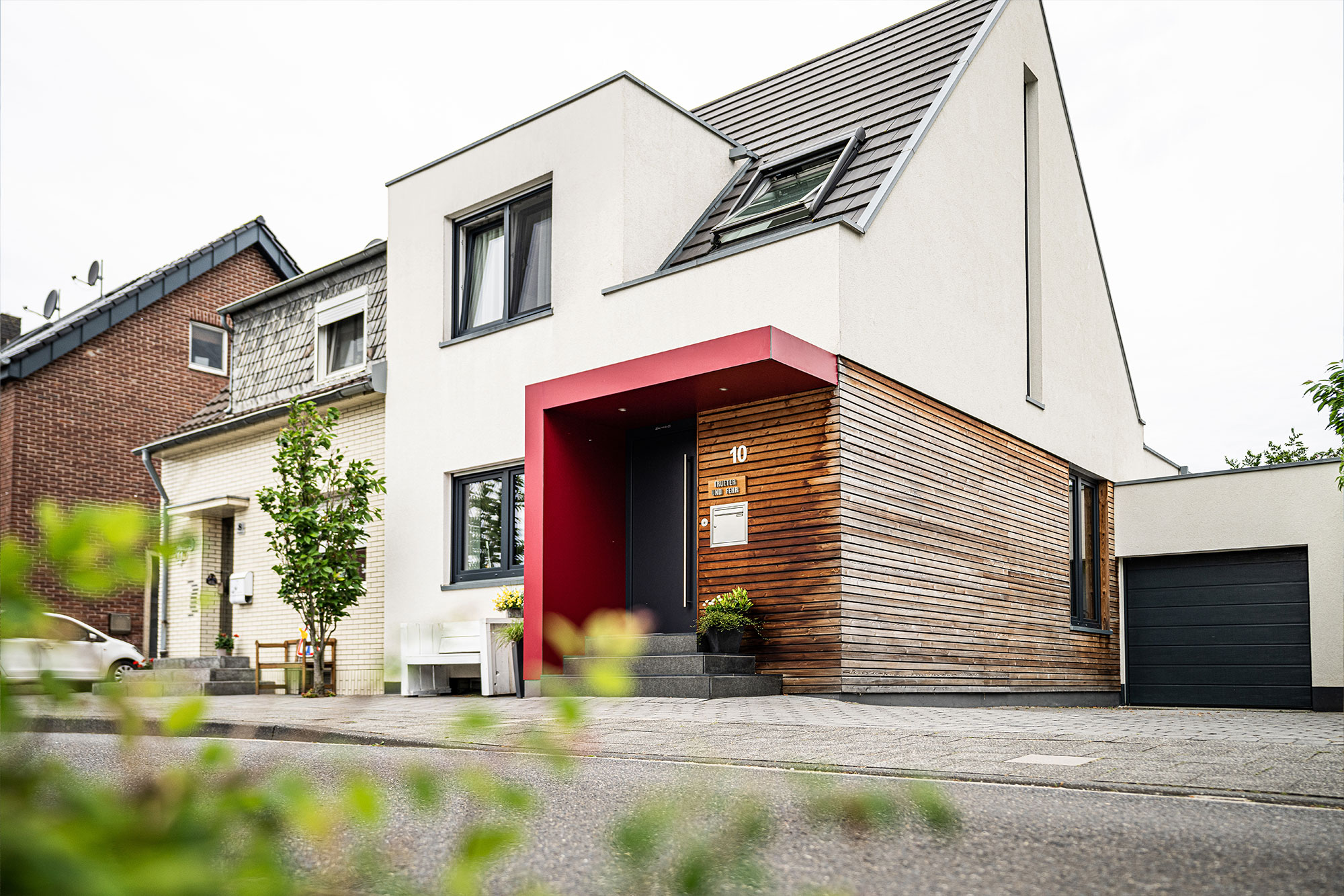 Die markante rote Eingangsüberdachung verleiht dem Haus Farbe und Freundlichkeit. Heute ist die Doppelhaushälfte ein Hingucker und wertet die Straße auf.
